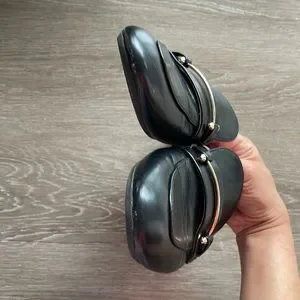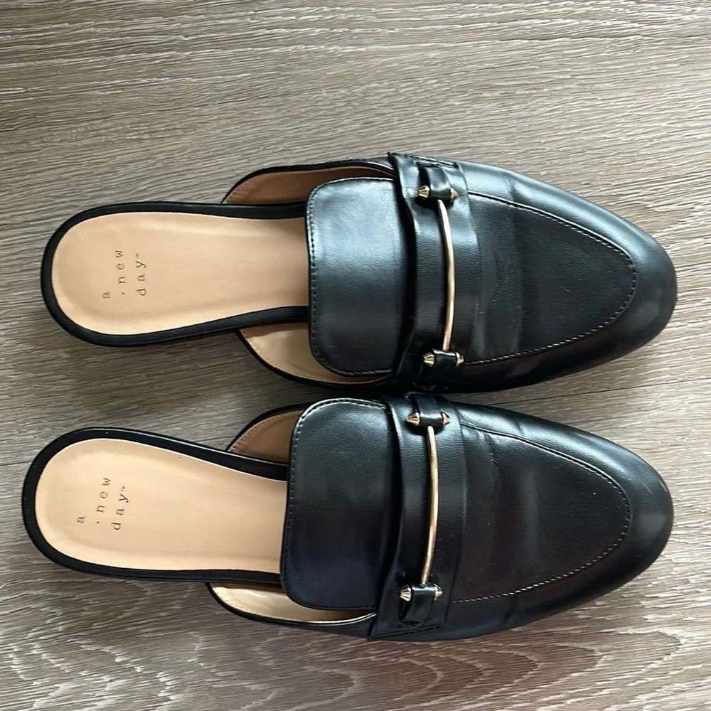 Black faux leather slide mules; super comfortable and in great condition; 1 in block heel; Memory foam insole construction; Pointed toe; Medium width; Slip-on style