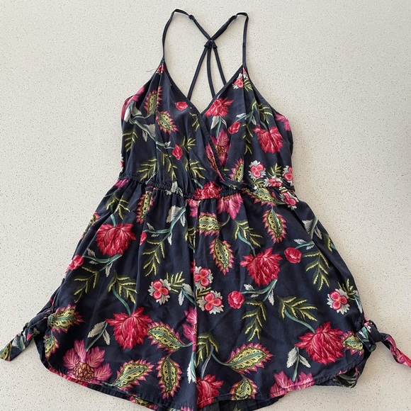 Washed black with floral colored romper, elastic waist, tie detail at the shorts, adjustable straps