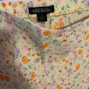 Vibrant floral print with orange, purple, and green on cream. Stylish and comfortable.