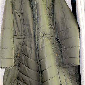 Hardly worn . 4x . Worm and cozy . Waterproof . Olive green with a hood . Longer mid length . Smoke free home . Not too heavy but still warm . Wind breaking .