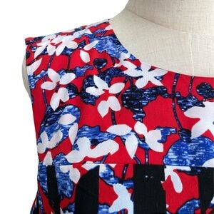 Target x Peter Pilotto Multi Colored Floral Sleeveless Shift Dress Size Large in very nice used condition. This popular limited edition collab produced this amazing dress with beautiful vibrant colors of red, black, blue and white in an all over striped and floral pattern. The dress is very lightweight and has a high neckline, hidden back zipper with hook and eye closure and a flounced hem line. Measurements laying flat are approximately 19” inches underarm to underarm and approximately 36” inches from shoulder to hem. Super cute dress ❤️ 💙