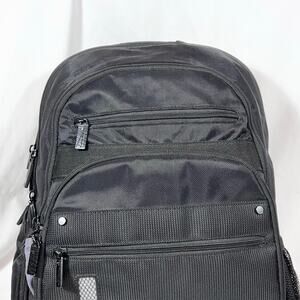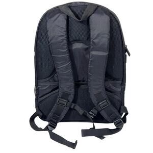 Introducing a Targus Revolution Checkpoint-Friendly Backpack with Safe Port protection, designed to fit laptops up to 15.6 inches. This backpack offers multiple compartments for organization and easy access during airport security checks. The item is pre-owned and in good used condition, showing light signs of wear.