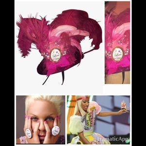 Tarina Tarantino handmade in America hot pink: sequin, love/hate collection brooch, with crystal ornament detail, & ostrich feathers. This is a celebrity worn brand (press pictures included). Only a few of these couture hats made period and each is one of a kind in terms of style. The hat features an elastic band attached which makes it easy to wear. Great New Year's Eve or party accessory. Never worn other than in photo shoot. Like new. No damages or signs of wear. Once in a lifetime piece.