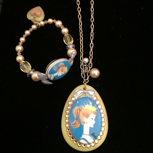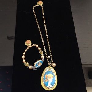 Tarina Tarantino x Barbie necklace and bracelet set. Yellow hearts and blue bow Barbie wearing crown with no missing beads and no missing crystals.