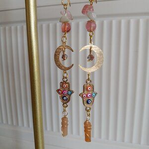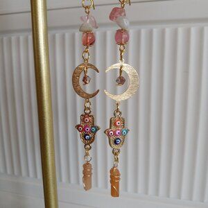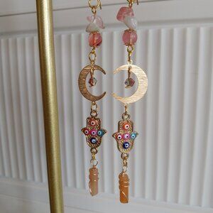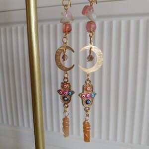 Discover the mystical beauty of our Tarnish Free Brass Gold Plated Crescent Moon Earrings. Adorned with Gold Hamsa Hand Evil Eye Charms and featuring stunning Strawberry Quartz, Prehnite, and Wire Wrapped Peach Aventurine stones, these earrings exude elegance and protection. Perfect for any occasion.