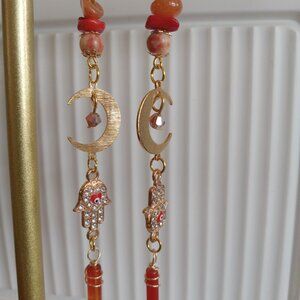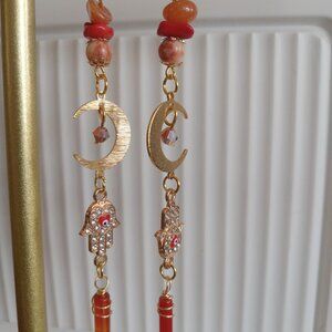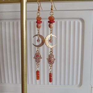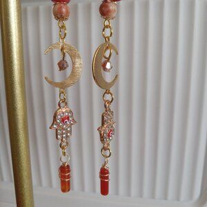 Bring uplifting energy into your life with our Tarnish Free Gold Plated Moon Earrings. Featuring a stunning combination of eye-catching rhinestone hamsa hand and evil eye charms, sunstone, red agate, redline jasper, and wire wrapped carnelian, these earrings offer a unique and stylish way to ward off negative energy and attract good fortune. Made with tarnish-free gold plated brass, they are built to last and make the perfect addition to any outfit.