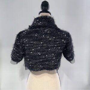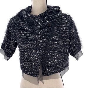 Tarnish jacket, Italian knitwear, cropped sweater jacket, boucle knit, tulle trim, black and white shrug, cowl neck cardigan, textured knit top, evening cover-up, Poshmark fashion, fall layering piece, elegant bolero