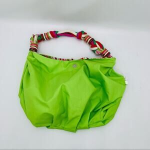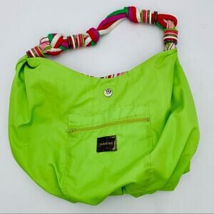 Tarnish Striped Soft Shoulder Bag. Braided rope straps. Striped fabric body. Bright green interior. Magnetic close.
