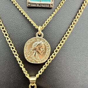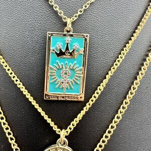 Aesthetic: tarot necklace, layered necklace, gold tone jewelry, the empress tarot, celestial jewelry, crescent moon pendant, coin pendant, boho style necklace, mystical jewelry, spiritual jewelry, vintage inspired, trendy necklace, zodiac style, astrology jewelry, Y2K aesthetic, charm necklace, turquoise enamel, layered chains, statement necklace, cosmic style