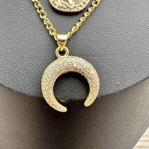 Adorable bundle of gold tone layered chain necklaces with tarot, coin and upside down crescent moon pendant.