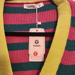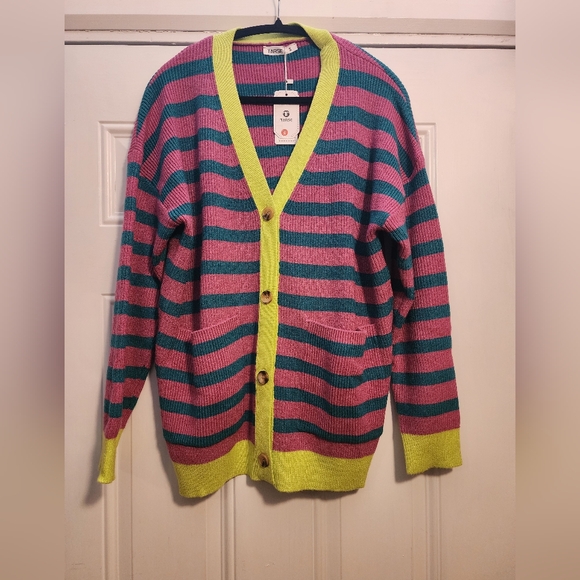 Vibrant striped cardigan featuring a button front. Colors include pink, teal, and neon yellow. This sweater is very oversized, can fit up to an XL.