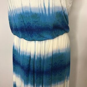 Tart maxi dress. Gorgeous white, blue and aqua ombré tie dye Ikat print on fabric. Elastic gathered waistband, super soft fabric. Dress has been hemmed, please see measurements.