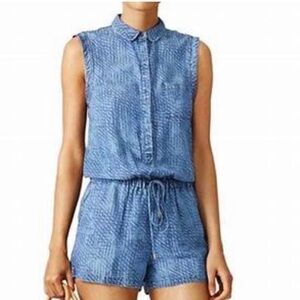 Tart Button-up Chambray Printed Denim Romper With Drawstring Waist Size L