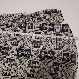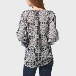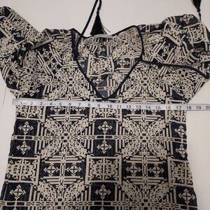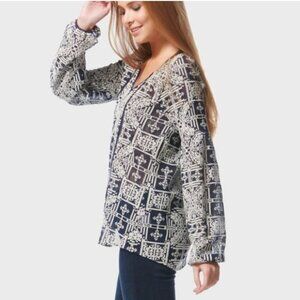 Size XS Tart Collection Aida Cross Stitch Woven Navy/Taupe Top. 100% polyester. V-neckline with front tassels. Long sleeve and gathered at wrist. Pit to pit 18" Length 26.5". Excellent pre-owned condition.
