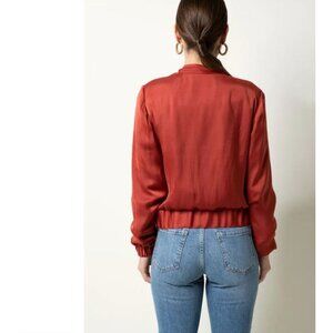 Stylish bomber jacket with a sleek design. Features a front zipper and ribbed cuffs. Ideal for casual outings. Chic, modern, stylish, silky, flattering, and comfortable. Currently retails for $168 never worn. Beautiful terracotta rust color, perfect for fall. Nice way to spiff up a casual outfit.