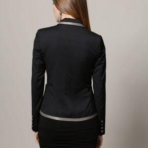 Contrast leather trim throughout, peak lapel, built-in shoulder pads, patch pocket at bust, dual front patch pockets, functional button sleeve cuffs, tonal top stitching