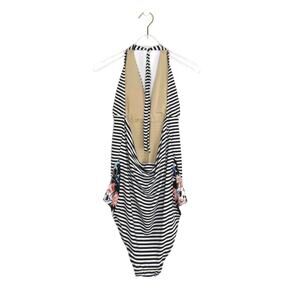 Tart Swim One Piece Swimsuit. Black and White Striped Plunge Neck Swimsuit. Halter Swimsuit with Lace Up Corset Detail and Cute Floral Ribbon Ties and Side Panels. Flattering One Piece Swimsuit.