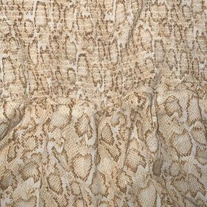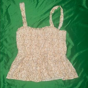 Elevate your style with this chic snake print peplum top. Perfect for any occasion, this cream and tan top adds a touch of elegance to your wardrobe.