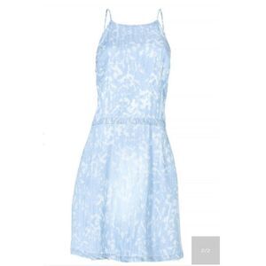 Denim A-line dress with adjustable straps boasts a zipper closure.