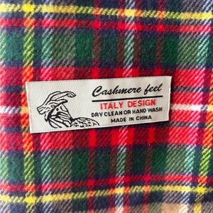 Soft scarf with a classic tartan pattern. Features red, green, and yellow hues. Cashmere-like texture.