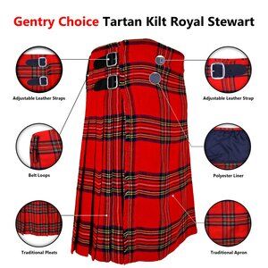 Gentry Choice Tartan Royal Stewart Tartan Kilt is made from quality Acrylic fabrics which you will love to wear and show off your Highlander spirit. Our Highlander Tartan Kilt’s vibrant red hues and intricate plaid pattern not only pay homage to the historic clan but also make a bold fashion statement. This Scottish Tartan Kilt showcases the rich heritage of Scottish tradition and offers a distinctive blend of sophistication and comfort. Perfect for formal occasions, weddings, cultural events, or even casual wear.