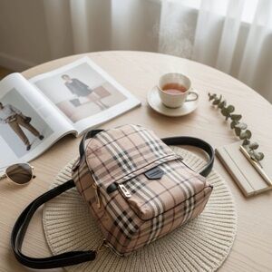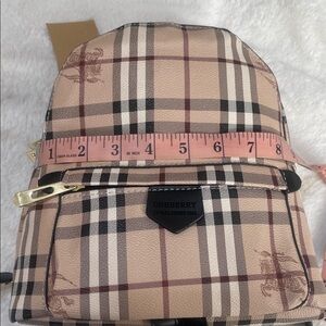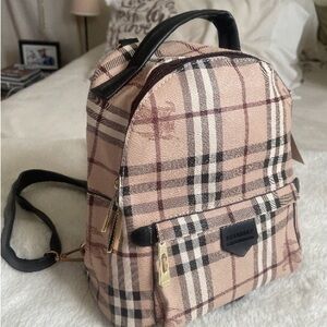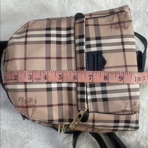 This is a compact mini backpack featuring the iconic tartan (plaid) print in shades of beige, black, red, and white, reminiscent of the classic Burberry design. It has black faux leather straps and a top handle, gold hardware (including zipper pulls), and a small front pocket. It's ideal for carrying essentials with a distinctive style touch.