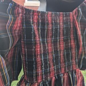 Super flattering red plaid smocked top. The Peplum waist is adorable! Sleeves may be worn on or off the shoulder.