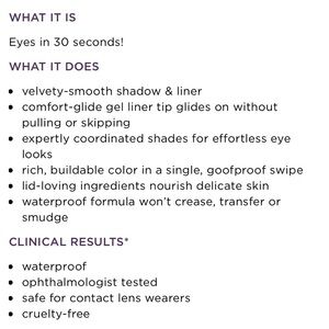 Customize your look according to your mood with this dual-sided, full-size shadow and liner. The velvety-smooth, pigmented shades are infused with Amazonian clay and vitamin E for an effortless, gel-like glide when applied. The formula is also talc-free, waterproof and safe for lens wearers.