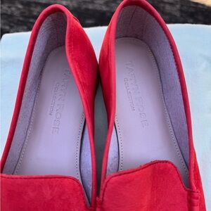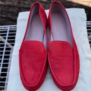 Chic suede loafers in a geranium shade. Offers comfort and style. Ideal for versatile wear. New in box, fabric shoe bag included.