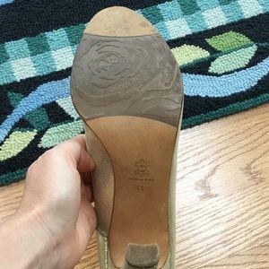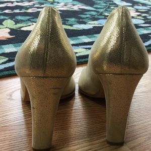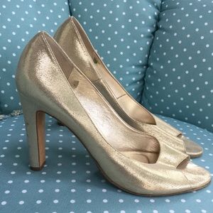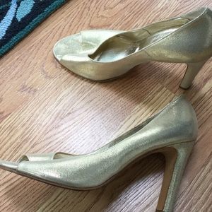 Gorgeous Italian leather Taryn Rose Metallic Gold open toe pumps in great condition. 3 1/2 inch heel- not practical for me. Who will be the lucky next owner of these fabulous heels?