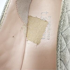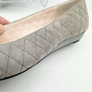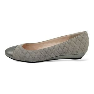 A quilted pattern adorns this sweet and feminine Pheasant style slip on ballet flat with a tiny patent wedge. A slight metallic sheen lets you dress these up or down.