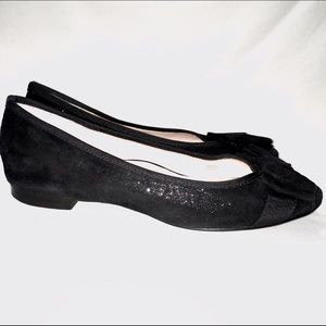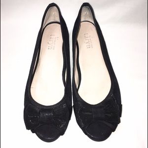 Taryn by Taryn Rose Black Shine Leather. Open Toe Flat women Shoes. They have a bow on the front toe area. Size 7.5 M //Pre-owned in good condition. No trading // No PayPal.