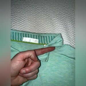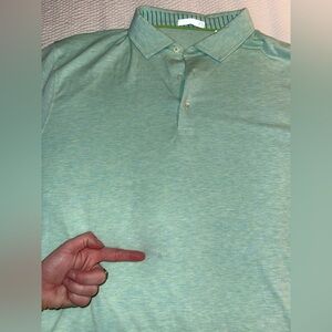 In great condition see photos for minor flaws- small stain that could likely be removed with peroxide or stain remover on front. Small small hole under collar where tag was removed. Back left shoulder has small streak (looks like dryer mark)