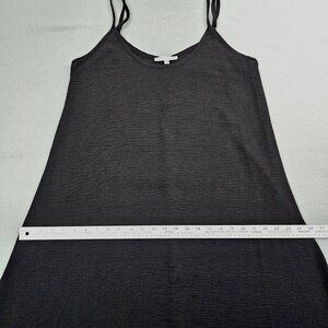 This Tash + Sophie dress showcases a sleek design with spaghetti straps and a flowy silhouette. Made from 100% polyester, it offers a comfortable fit with easy maintenance. Ideal for warm weather, or layering for cooler Fall temperatures. Its classic black color and simple elegance make it a versatile addition to any wardrobe. Very good pre-owned condition with no noted flaws.