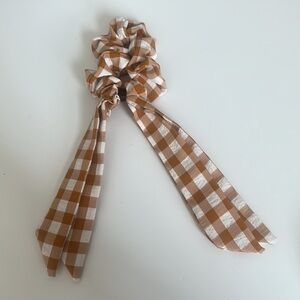 A pair of soft hair scrunchies—each with trailing tails—comes patterned in classic dots or gingham plaid for two cute looks.