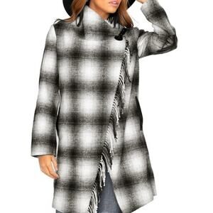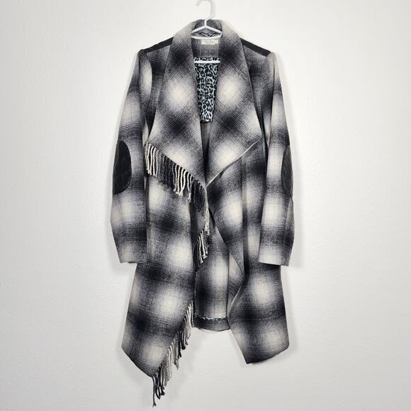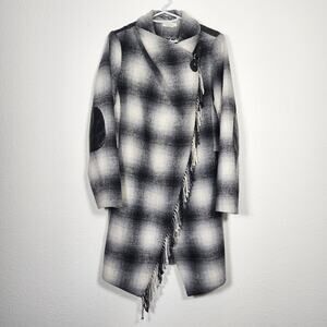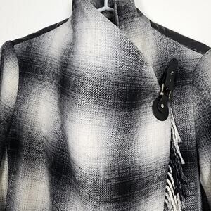 Tasha Polizzi Fringe Wrap Coat Western Ranch Plaid Wool Elbow Patches Size Small