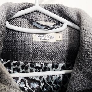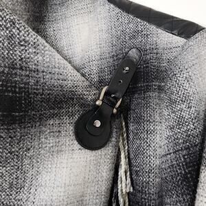 On offer is this lovely Tasha Polizzi Collection Oxford coat. Size small. Black and off-white soft plaid with black leather/faux leather details. While there is no material tag, I've come across other listings of this piece which confirm that it's comprised of 51% wool and 49% polyester with a 100% polyester lining. It features fringe details and a wrap / overlap style which is secured with a hidden snap button and a darling buckle 'snap' closure 'western' detail. "Leather" trimmed pockets, quilted leather elbow patches, and quilted leather upper back details make this coat stand out further. The pockets have a soft satiny lining and there is a contrasting leopard partial lining inside the coat. In excellent preowned condition. This coat could also fit a size medium. Please consult measurements below.