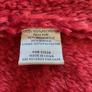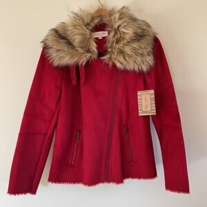 Red faux suede Moto Biker jacket with a faux fur collar and an asymmetrical zip The jacket features two zippered front pockets, detachable faux fur collar.