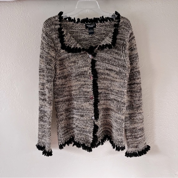 Tashia London | Brown Cashmere Rustic Knit Fringed Button Front Cardigan, Large