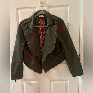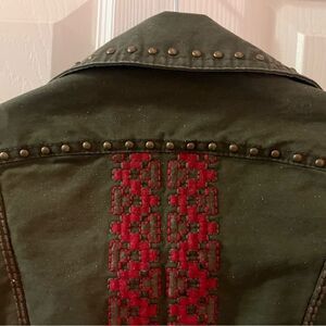 Denim jacket from Taska Polizzi collection. Green with embroidered flowers, buttons and zippers. Graduated hem , little shorter in back. Western Style, this is a jacket with an edge! Size L, runs small, for s like a M. Pit to pit: 19.5”, length: 20 in back, 21” in front,Excellent condition.