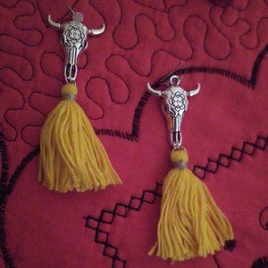 Silver dangle earrings with a cotton tassel with bull skull
