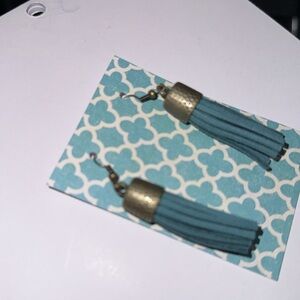 Tassel earrings teal blue dangle faux suede vintage brass patina hardware NEW