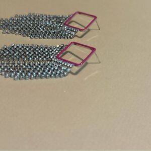 Pink enamel rhinestone drop stud earrings in silver tone hardware