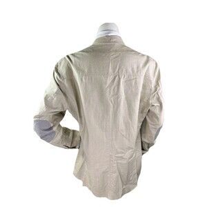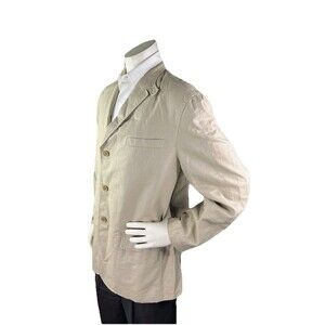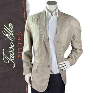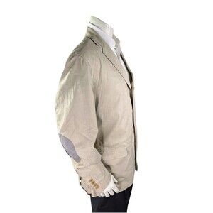 The Tasso Elba Fitted Men XL Elbow Patch Linen Cotton Casual Summer Jacket is a stylish and versatile piece perfect for warm weather. Made from a blend of linen and cotton, this safari-style jacket features a solid beige color and a four-button sleeve detail. Ideal for travel, parties, or casual outings, this jacket is machine washable and designed for a comfortable regular fit. The classic notch lapel and three-button front closure add a touch of sophistication to this sport coat, making it a must-have for any man's wardrobe.