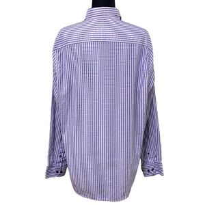 Tasso Elba long sleeve button-down shirt in excellent pre-owned condition with no flaws. Features a lavender and blue vertical stripe pattern with a classic collar, and button cuffs. Made of 100% cotton—lightweight, breathable, and ideal for business casual or smart everyday wear.
