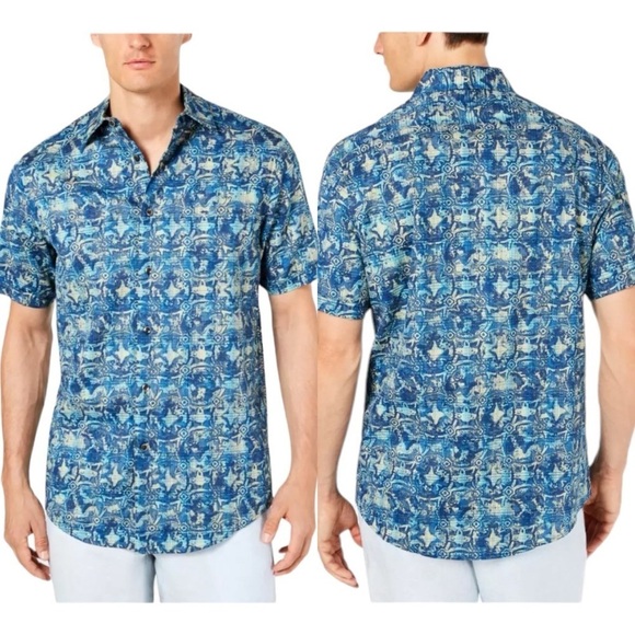 Tasso Elba Men's BLUE Short Sleeve Cotton Print Shirt Size L. 100% Cotton great shirt for the summer hangouts, vacation, causal, date night.