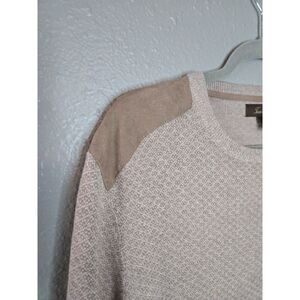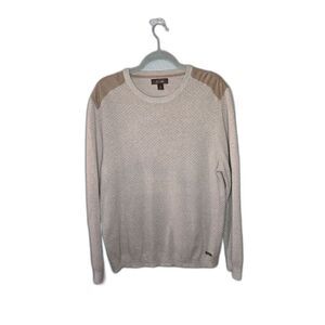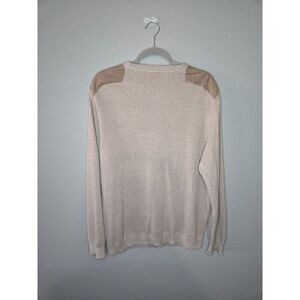 Tasso Elba Men's Silk Blend Knit Long Sleeve Pullover Crewneck Sweater. Medium Weight. Very soft. Suede like shoulder patches. Color is Taupe Heather. 80% Cotton; 20% Silk. Business Casual. Workwear. Office. Professional. Preppy. Sophisticated. Grandpa. Dad. Size Large. Excellent Used Condition.