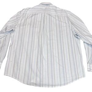 This listing is for a stylish Tasso Elba men's long-sleeve button-down shirt in size XL. The shirt features a classic striped pattern with a mix of gray, blue, white, and subtle accent colors. It is a versatile piece that can be worn for business casual or everyday occasions. Excellent preowned condition.