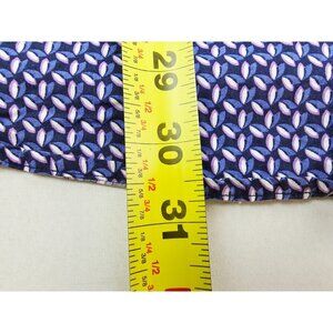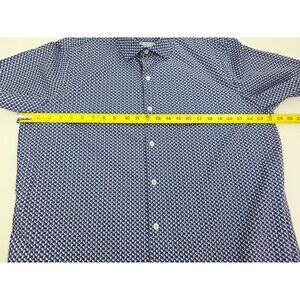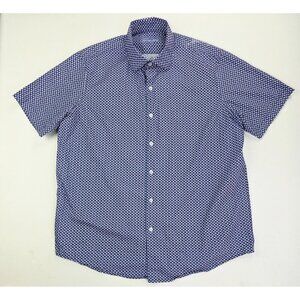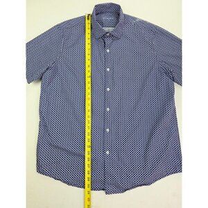 The Tasso Elba Size XL 17-17.5 Black Blue White Lavender Ovel Pattern Cotton Shirt is a colorful and versatile button-up shirt perfect for various occasions such as travel, weddings, parties, casual outings, formal events, and workwear. Made of cotton with a regular fit, this shirt features a collared neckline, short sleeves, and button closures. The graphic print of blue and lavender hues on a black and white base adds a stylish touch to the shirt, making it a standout piece for any man's wardrobe. Machine washable and suitable for all seasons, this shirt from Tasso Elba is a must-have addition to any collection.