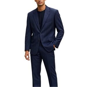Elevate your look with this Tasso Elba two-piece suit made from luxurious Super 110’s Vitale Barberis Canonico Italian wool. Featuring a navy blue pinstripe pattern, tailored 48R jacket with 3-button closure, and matching 42R pants with rolled ankle hems for a modern finish. Perfect for business, formal events, or polished everyday wear.